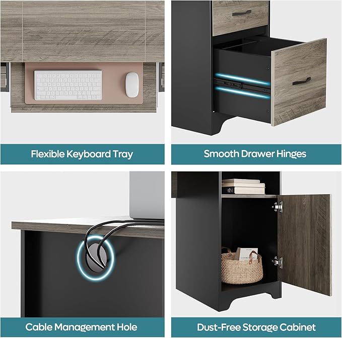 - Versatile Storage: This large desk features 2 open storage compartments, a storage drawer, a file drawer for letter/A4/legal-size hanging file folders, and a dust-free storage cabinet, offering a variety of storage options to keep your workspace organized and your essentials dust-free