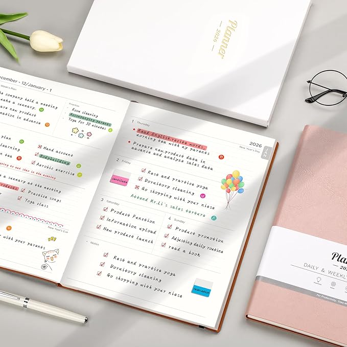 - Comprehensive Planning: This 2026 planner covers everything you need for year-round planning, including Yearly Overview & Schedule, Important Dates, Holidays, Habit Tracker, Yearly Goals, Month Summary, Note Pages, Address Book, Password Organizer, and US time zone map. Special sections facilitate comprehensive planning, while Sticky Notes Divider simplify navigation