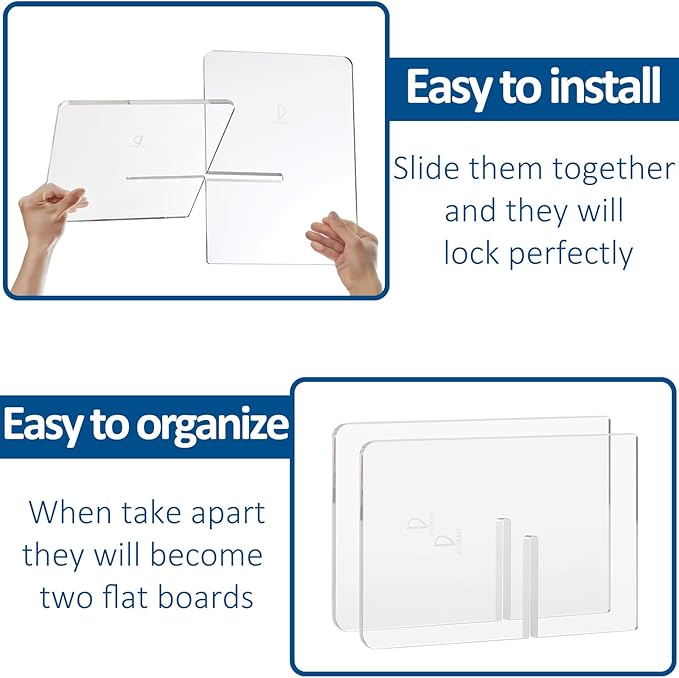 - 【Easy Fit Together and Take Apart】Just put the 2 pieces together using the slots in the middle, slide them together and they will lock perfectly. When take apart, the acrylic book stand will become two flat boards, which is easy to organize and carry.