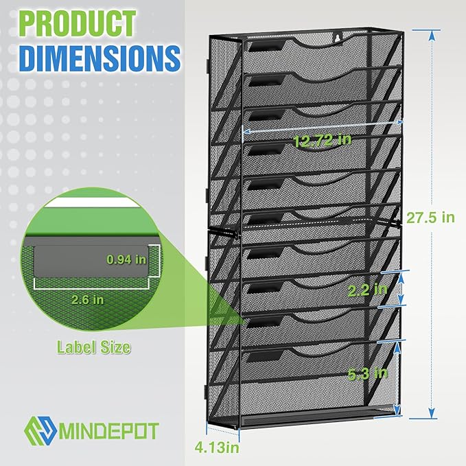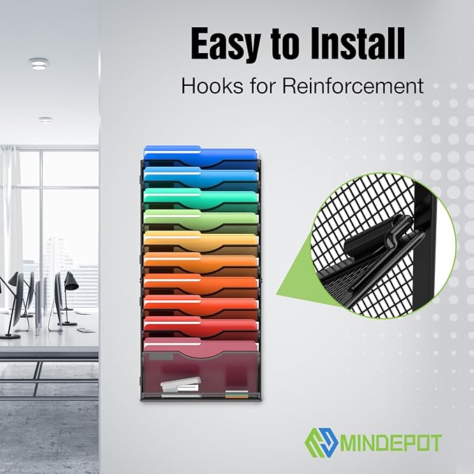 - Efficient Organization Solution: MINDEPOT hanging wall mount file holder can keep your workspace clutter-free and organized with this wall file organizer. Say goodbye to scattered papers and cluttered desks. Stay on top of your important documents with this convenient organization solution