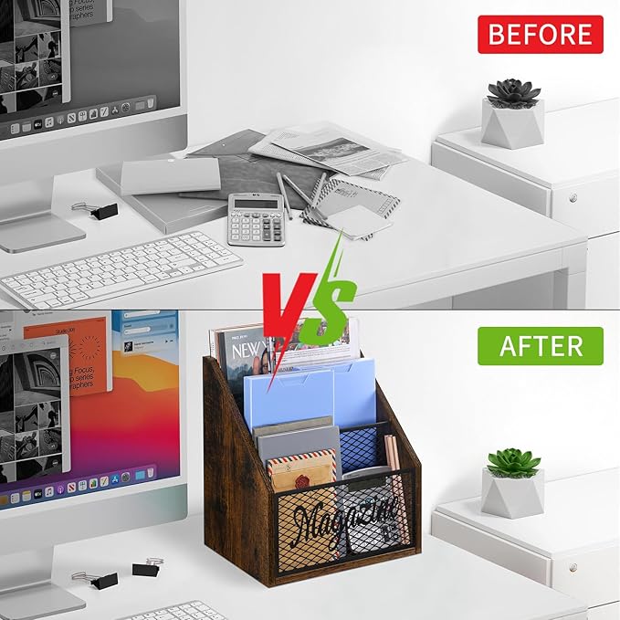 - Unique Sloped Design:Unlike other magazine holders,the magazine rack boasts a special design with three stepped sloped compartments, an exclusive creation by our designers.Ergonomically designed, it allows for easy retrieval and placement of magazines and documents.Different lengths of files can be placed in varying depth compartments,effectively organizing mail,bills,magazines,and office documents.
