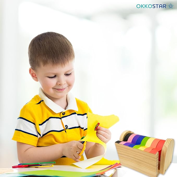- 【CRAFT TAPE DISPENSER FOR MONTESSORI AND MORE】Wood masking tape dispenser for kids to easily sort, organize, and store masking tapes and craft tapes. Classic art and craft holder for Montessori settings. No more mess after art and craft activities!
