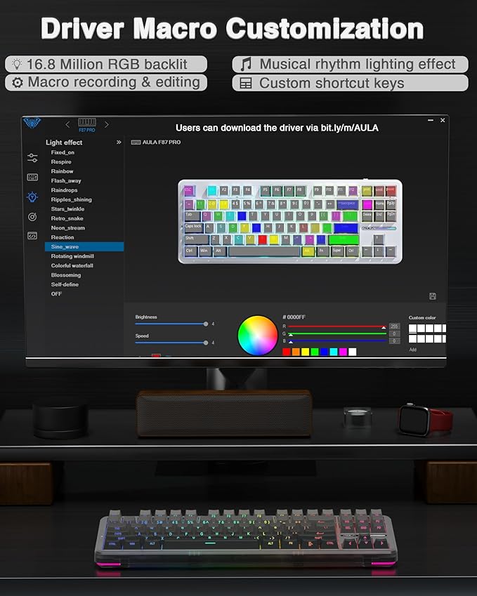 - 16.8 Million RGB Backlit: F87 Pro light up led keyboard features 16.8 million RGB lighting color. With 16 pre-set lighting effects to add a great atmosphere to the game. And supports 10 cool music rhythm lighting effects via driver. Lighting brightness and speed can be adjusted by the FN + key combination. You can select the single color effect as wish. And if you can turn the backlight off if you do not need it
