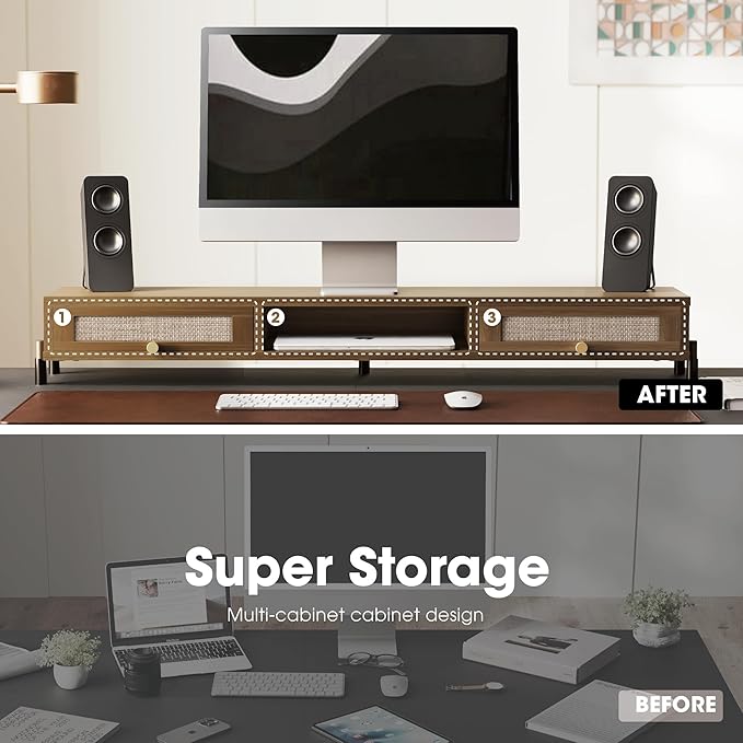 - 【Vintage Stand】Fenge dual monitor stand with drawer showcases a beautiful vintage-inspired design, featuring exquisite rattan weaving, classic flip drawers with an antique finish, and elegant bronze metal drawer buckles. It not only elevates your computer monitor but also enhances your workspace aesthetics, making it a stunning addition to your office decor.