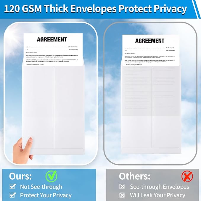- 【Protect Privacy】The white manila envelopes are made of 100GSM double-adhesive paper, thick and sturdy, which features exceptional rip, tear and puncture resistance, made to last. 6 x 9 envelopes are thick enough to prevent transparency and ensure the items inside are not see-through. keeping your contents private and refusing to leak.