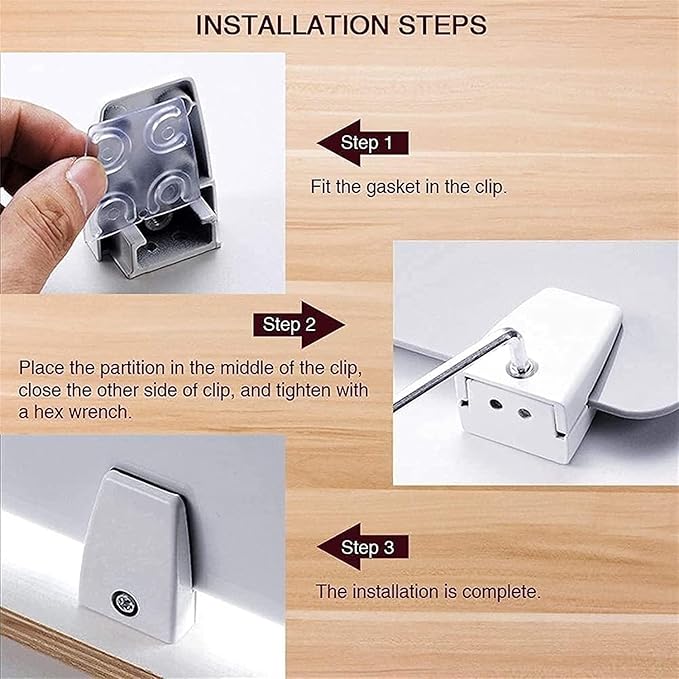 - Easy Installation: Clamp these desk dividers to your desk for a secure, yet flexible setup. 1.Peel the greenish film; 2.Install the washer in the clamp; 3.Put it on the table and tighten it with a screwdriver, or use the nail-free glue to fix the clip on the table; 4.Place the partition in the middle of the clamp, close the other side and tighten it with a wrench