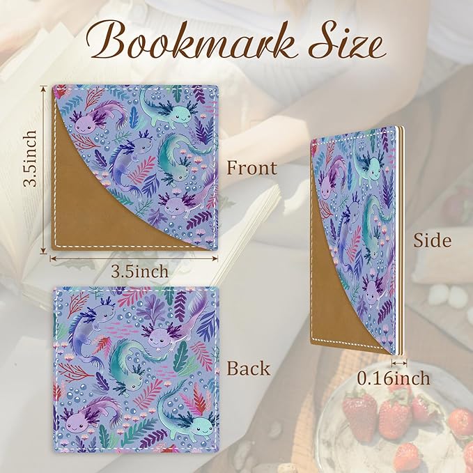 - Cute Axolotls Art Design: Add a playful touch to your reading with leather corner bookmarks featuring cute Axolotls art. These designs capture the spirit of Axolotls, bringing joy to your reading experience. The vibrant imagery embodies adaptability and resilience, blending practicality with artistic flair. This accessory secures your page while inspiring book lovers with its whimsical theme, making it a thoughtful gift for those who love unique designs and the world of amphibians.