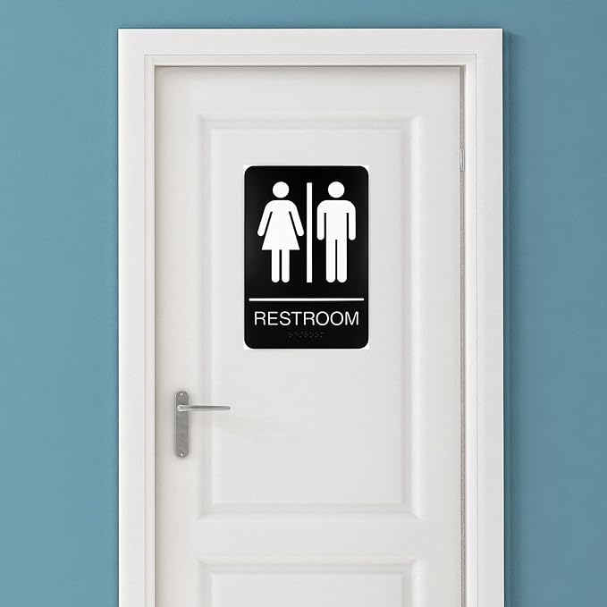 Self-Adhesive Business Restroom Sign, ADA Compliant Braille Unisex Bathroom Sign, Size: 9" X 6" (Unisex)