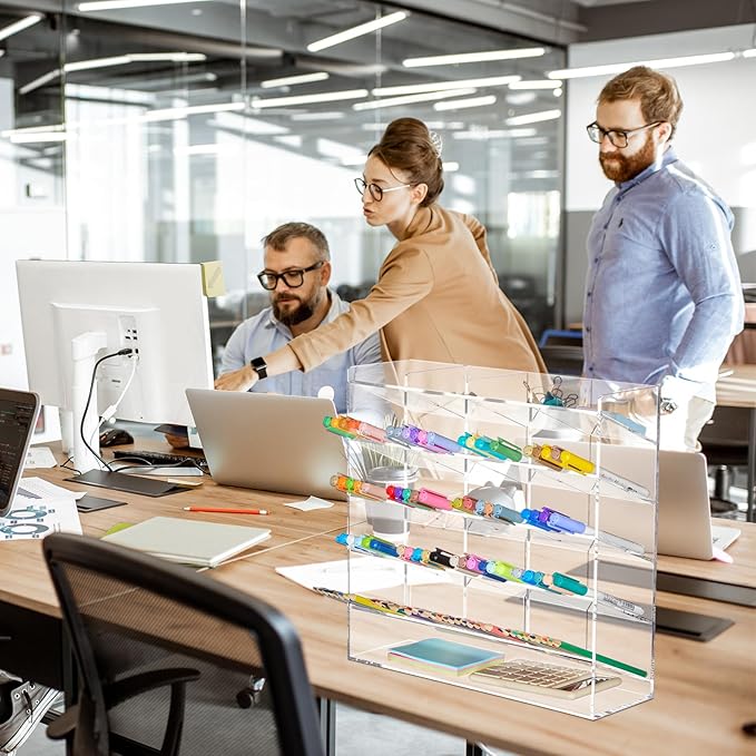 - Clarity and Accessibility: this acrylic vertical marker organizer boasts charm with its clear, acrylic design; It allows you to instantaneously visualize stored items, ensuring an uncomplicated item placement and retrieval process; The transparency of this organizer suits any workspace, blending with your office, or study room, while adding a touch of sophistication