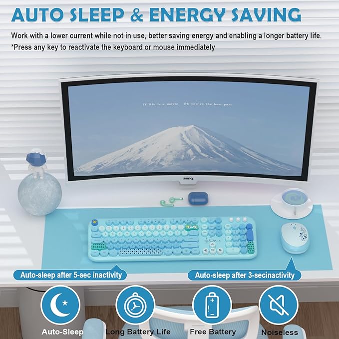 - Retro Floating Round Keycaps: Colorful keyboard and mouse wireless with vintage typewriter-inspired retro floating rounded keycaps, gives you the most comfortable typing experience and adds some much needed spunk to your desk; the crisp key sound takes you back to the industrial era, and the independent round keycaps facilitate finger positioning; the floating keys under your fingertips are comfortable and skin-friendly