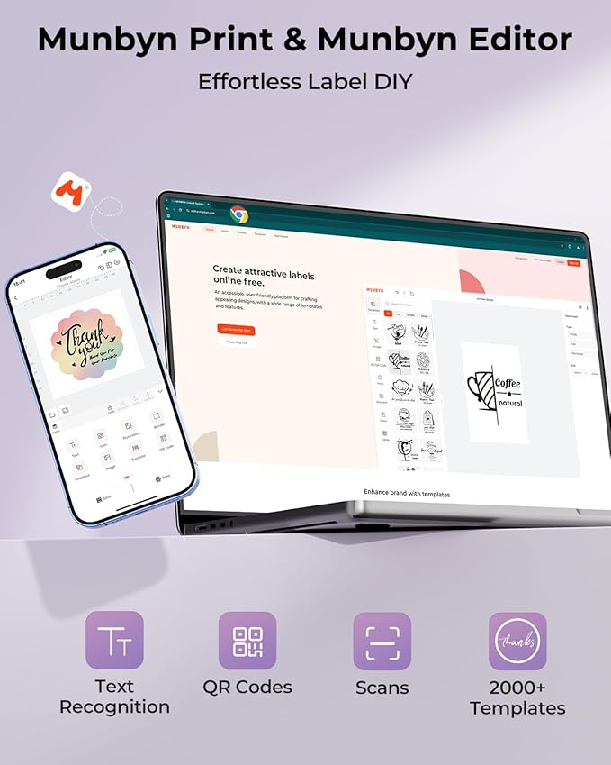 - Customize labels for any occasion: With MUNBYN thermal label printer, access 3,500+ elements, 2,000+ templates, and 80+ fonts. Import PDFs/TXTs or use OCR for text recognition. Enjoy multi-language support across platforms.Download 'MUNBYN Print' for mobile and tablet, or visit the Google Chrome 'Munbyn editor' for laptop and desktop