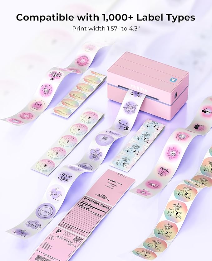 - Wide Compatibility: Works with major shipping platforms like FedEx, UPS, and USPS, as well as marketplaces including Amazon, Shopify, Etsy, and eBay. This shipping label printer supports labels ranging from 1.57" to 4.3" in width and is available in colors such as pink and Lavender Purple. Note: The 130B Bluetooth thermal printer may have issues with UPS thermal paper; MUNBYN thermal labels are recommended