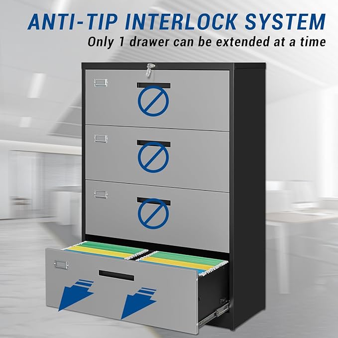 - ANTI-TILT DESIGN- When you fully open one drawer of this file cabinet, the other drawer cannot be opened. This is to prevent the drawer from storing too much paper and causing the cabinet to topple over.