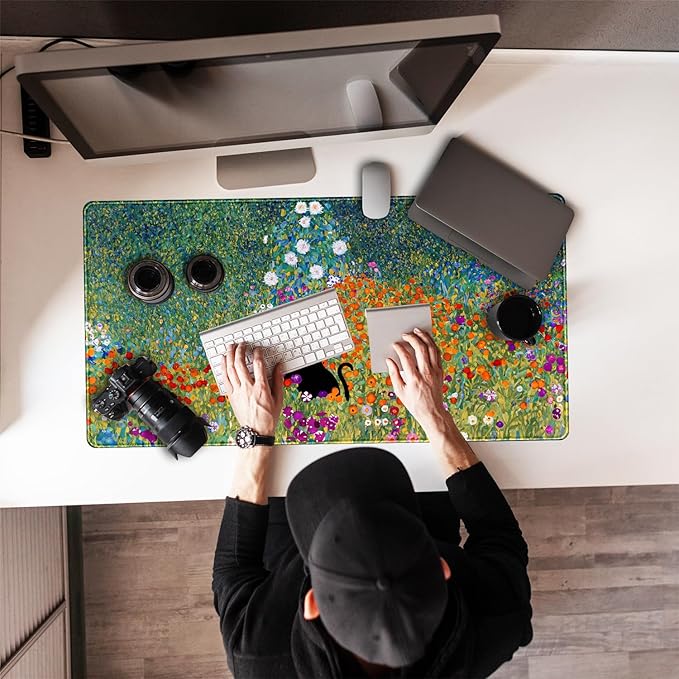 Desk Pad Cute Black Cat Oil Painting Art Floret Desk Mat Office Desk Decor Large Mouse Pad Gaming, XL Mousepad Women Office Desk Decor Laptop Keyboard Mouse Pads with Stitched Edges Mat 31.5x15.7 in