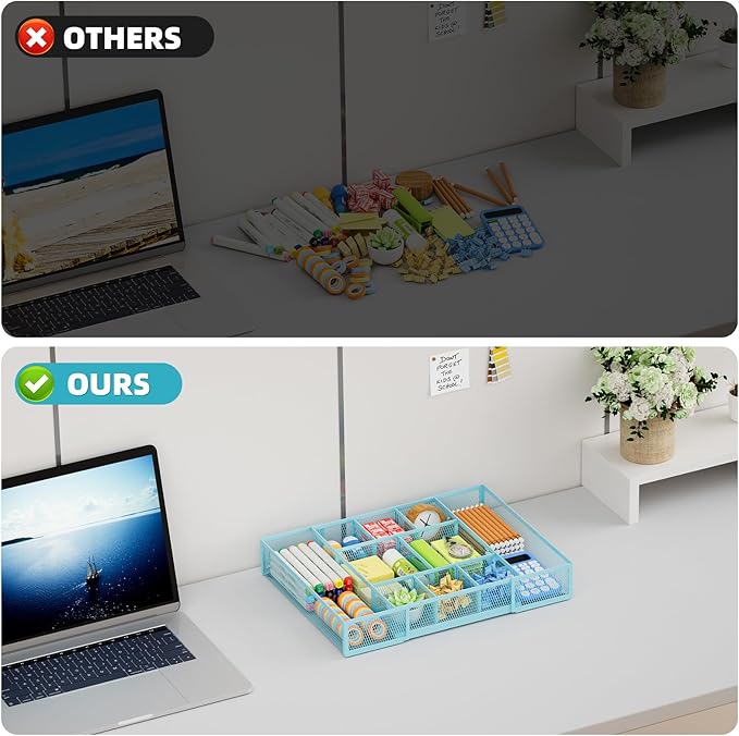 Marbrasse Expandable Desk Drawer Organizer, Mesh Drawer Organizer Tray with 10 Adjustable Compartments, Desk Organizers and Accessories for Office Supplies, Makeup & Vanity (Expandable-Blue)