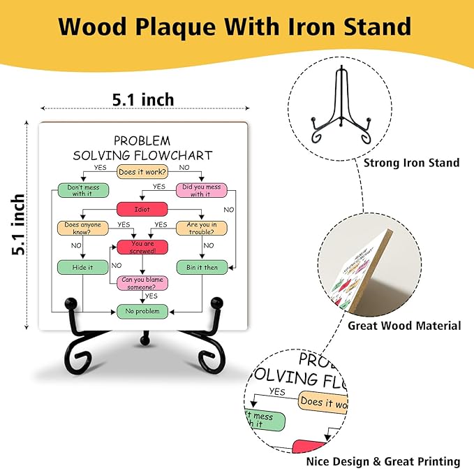 Wood Sign with Stand - Problem Solving Flowchart, Appreciation Gift for Coworker Problem Solvers Boss Colleague Leader - Table Centerpiece Home Desk Decor Plaque -51