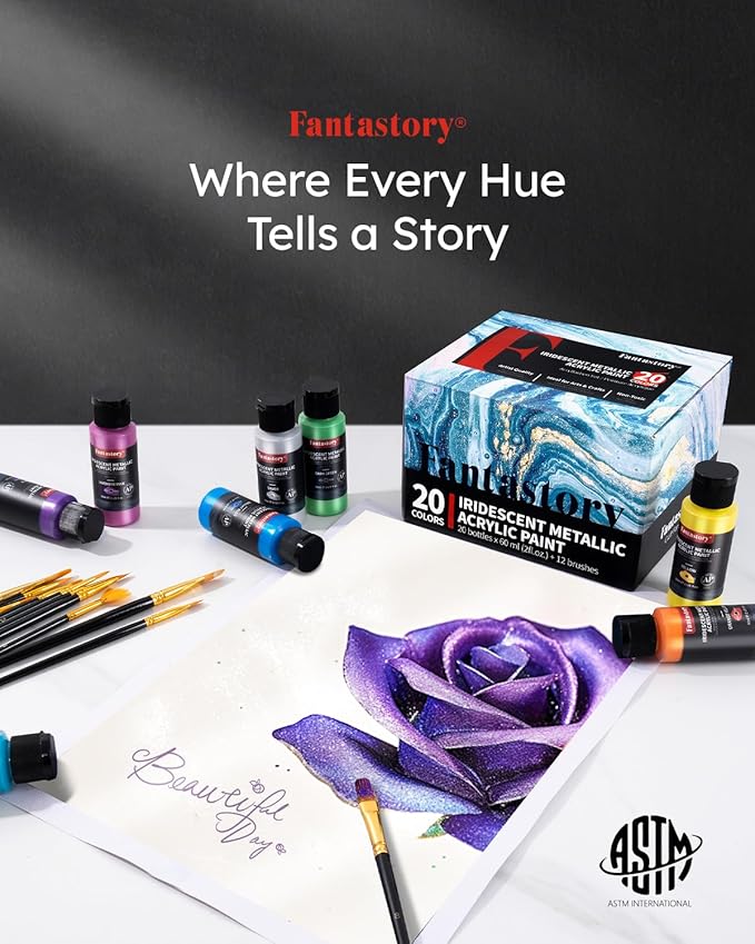- SHIMMERING HIGH-PIGMENT METALLIC COLORS: Fantastory 20-Color acrylic paint set features unique shimmering metallic hues with an exceptionally high pigment concentration and outstanding pigment deposition, offering exceptional coverage and unmatched color brilliance. Perfect for professional artists, painters, art instructors, dedicated hobbyists, and motivated beginners.
