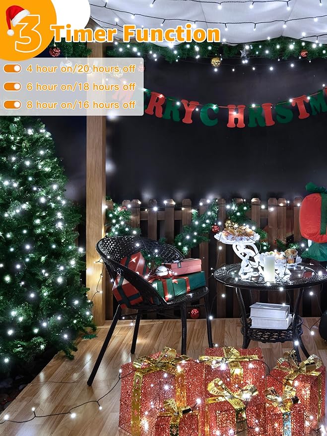 - Timer Memory Function: The LED Christmas lights features 3 timer function; 4 hrs on & 20 hrs off; 6 hrs on & 18 hrs off; 8 hrs on & 16 hrs off; The memory mode will save the previous settings