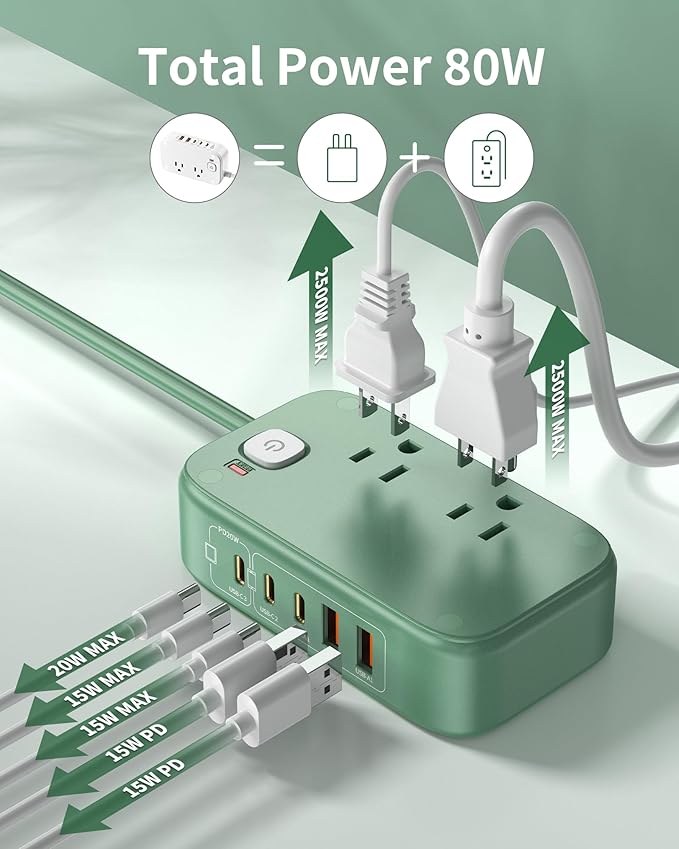 - 20W PD Fast Charging: Utilizing fifth-generation GaN technology, this compact and efficient USB-C power strip delivers 20W of fast power. Charge your phone from 0% to 50% in just 30 minutes, making it perfect for home, office, parties, school, and travel scenarios. This feature makes it one of the best power strips with surge protection on the market