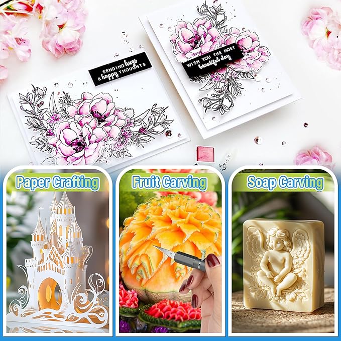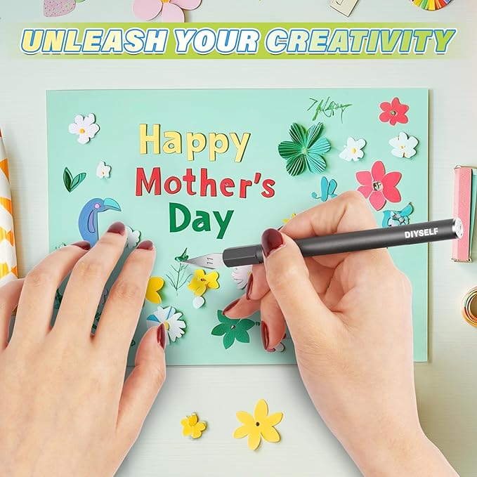 - Durable and Dedicated: Equipped with 10 additional SK-5 high-carbon steel blades, our craft knife guarantees durability and sharpness. These blades are designed to withstand wear and corrosion, ensuring they remain sharp for longer periods. The Sharp tip allows for precise and accurate cuts, making it ideal for detailed and intricate work. Additionally, exacto knives feature a magnetic design at the tail end, which aids in the safe and easy replacement of blades.