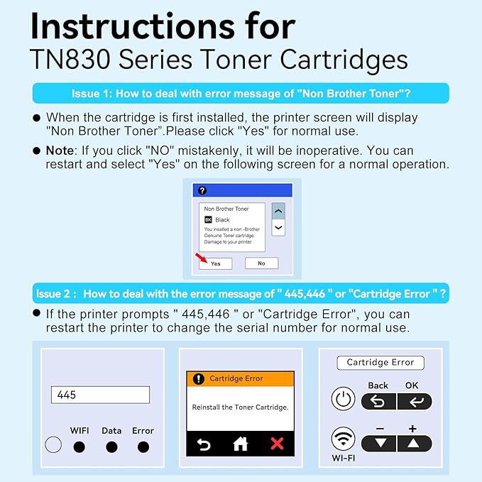 - 【TN830XL Friendly Tip】If the printer displays '445,' '446,' or 'Cartridge Error,' please restart the printer to resume normal operation.