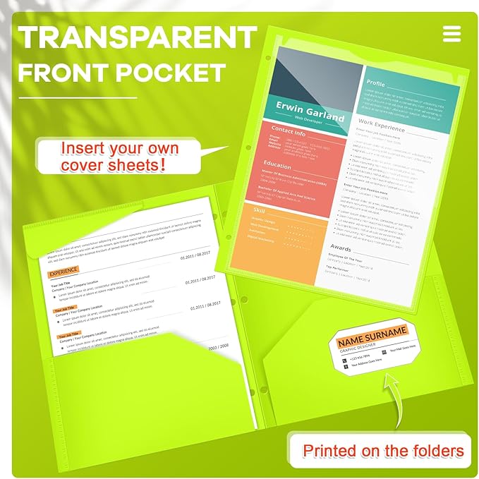 - Easy Organization: each plastic pocket folder features with 3 holes in one side, which enables you to put it into a standard 3 ring binder to organize loose documents, and clear front pocket of each folder help to store other items, giving you a comfortable using experience