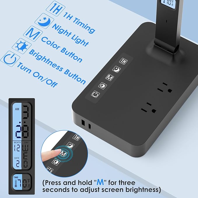- [Multiple Charging Functions]: Desk lamp is equipped with 1 USB-A(5V/2.1A), 1 Type-C Charger Port (5V/2.1A), 2 Safety AC Outlet Power. You can charge your mobile phones, tablets, laptops, and other electronic devices at the same time.