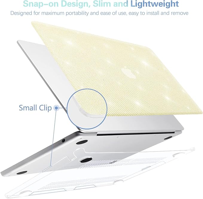 - Functional Design: This MacBook Air 13 inch glitter case is designed to be ultra-thin and lightweight, ensuring reliable durability without adding unnecessary bulk or weight. It features micro-clips that securely attach to the laptop and can be easily removed when needed. It offers easy application and removal. In addition, the bottom of the case has ventilation slots to help dissipate heat and prevent overheating, while the four rubber feet provide stability and a non-slip grip.