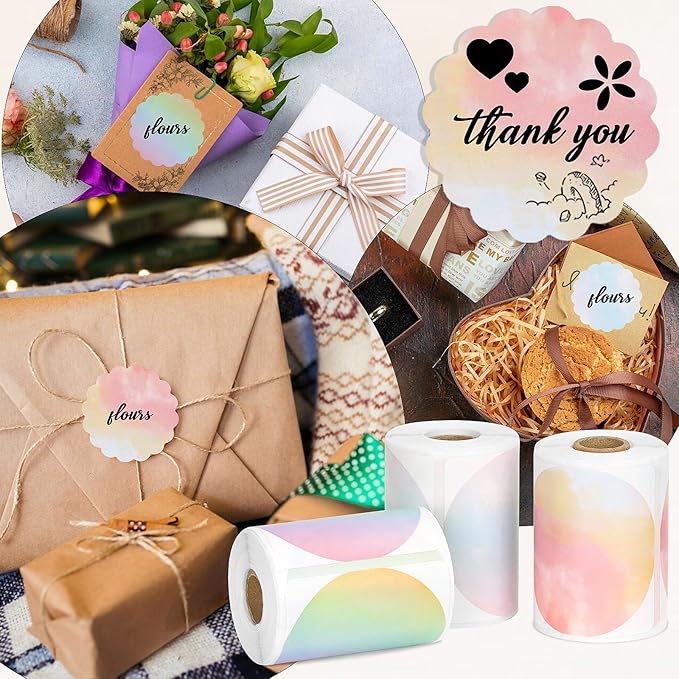 - 3 Rolls of Round Thermal Labels:HuiJuKeJi thermal self-adhesive gradient labels have 3 rolls, each roll color is gradient azure, gradient blue-pink, gradient rainbow, 140 labels/roll, 420 labels in total. Size: 1.96 "x1.96" (50x50mm). You can write or print many different text and patterns of round gradient color labels make your products more unique and eye catching.
