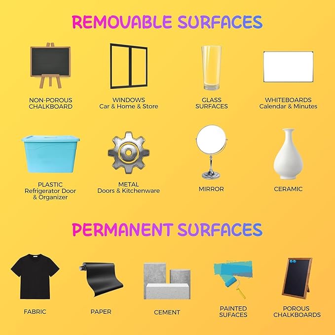 - ăEvery Corner of Life, Endless PossibilitiesăSFAIH Liquid chalk markers writes on any smooth, non-porous surface. Classroom notes on blackboards; meeting points on whiteboards; family calendars; fridge meal plans; glass window party doodles; kids' art easels; pantry jar labels. From blackboard to sports cars, family calendars to glass windows, SFAIH Chalkboard markers transforms the world into your canvas.