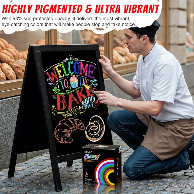 - ăMore Vibrant ColorsăSFAIH 24-color chalk markers for blackboard uses high-concentration Italian ink to cover any background effortlessly, visible up to 50 feet with neon-like brightness. 4 metallic chalk markers shades infused with pearlescent particles deliver gilded finishes for calendars or window art. Liquid chalk markers premium pigment formula withstands 21 days of outdoor weathering and sunlight while maintaining original vibrancy.
