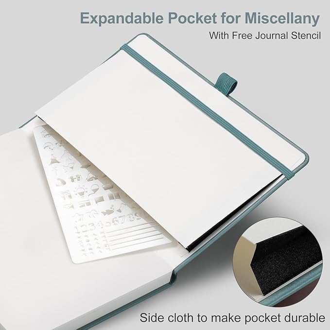 - CONVENIENT AND PRACTICAL LAYOUT: Features a pen holder for easy access to your pen, an elastic band to keep your notebook securely closed, 2 bookmarks for quick page referencing, an inner pocket for storing loose papers, and 2pcs journal stencils for additional creativity