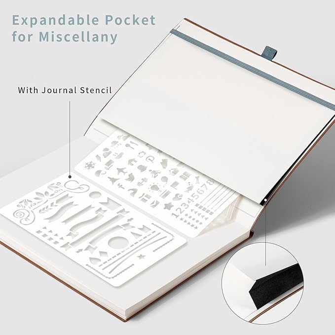 - CONVENIENT AND PRACTICAL LAYOUT: Features a pen holder for easy access to your pen, an elastic band to keep your notebook securely closed, 2 bookmarks for quick page referencing, an inner pocket for storing loose papers, and 2pcs journal stencils for additional creativity