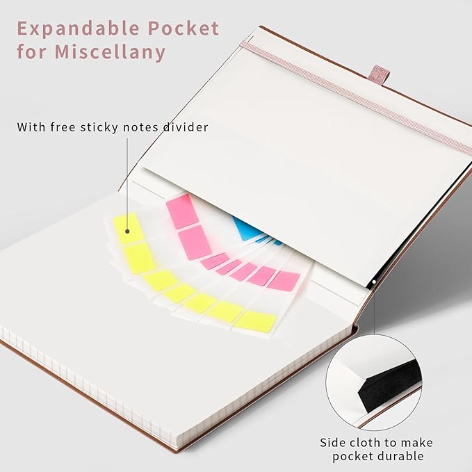 - CONVENIENT AND PRACTICAL LAYOUT: Features a pen holder for easy access to your pen, an elastic band to keep your notebook securely closed, 2 bookmarks for quick page referencing, an inner pocket for storing loose papers, and 18pcs sticky notes for additional organization and reminders