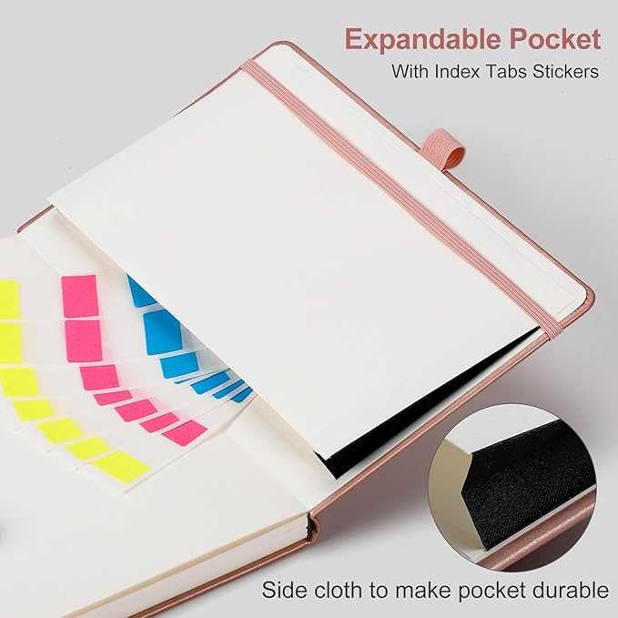 - CONVENIENT AND PRACTICAL LAYOUT: Features a pen holder for easy access to your pen, an elastic band to keep your notebook securely closed, 2 bookmarks for quick page referencing, an inner pocket for storing loose papers, and 18pcs sticky notes for additional organization and reminders