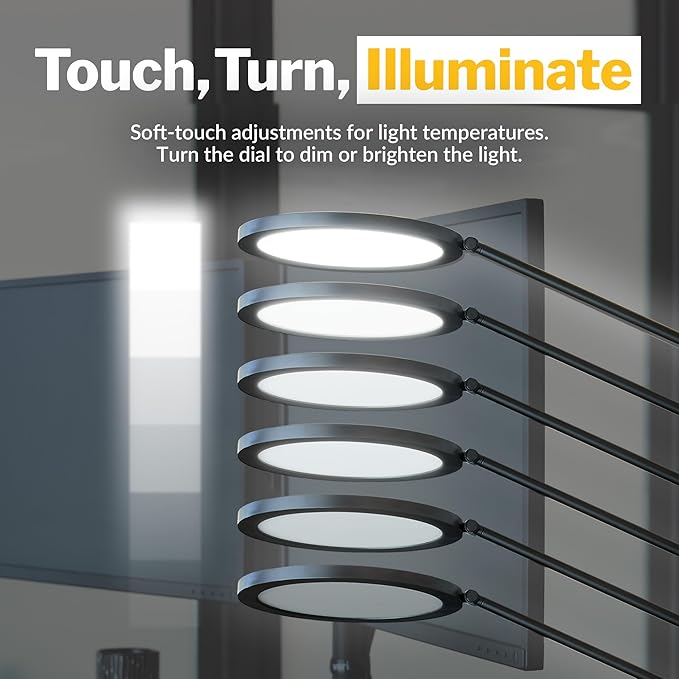- One-Touch Soft Technology: Effortlessly toggle the brightness dial on the desk lights for home office to turn it on or off, and adjust the color temperature between Warm (3000K), Natural (4200K), and Cool (6200K) for personalized illumination.