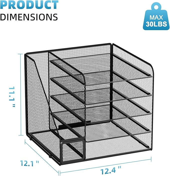 - 【Space Saving】All office document folders would be organized by the vertical file holder. The paper tray organizer is very suitable for storing books, magazines, letters, and A4 paper. The desk organizer enough accommodate all office supply accessories, such as pens, pencils, scissors, and so on. Perfect Size: 12.4*11.1*12.1inch