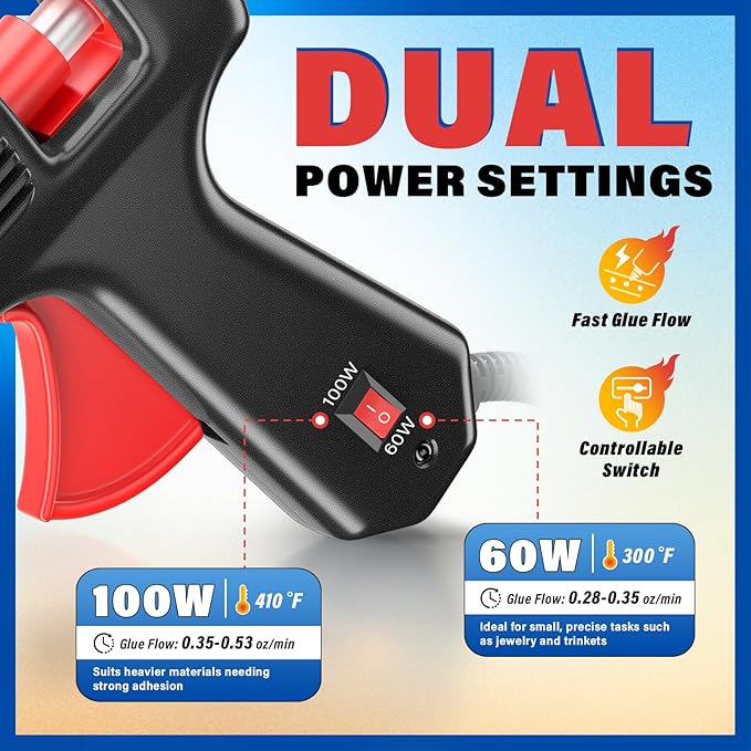 - Quick Preheating: This hot glue gun features dual power settings of 60W and 100W, allowing for 3-5 minute quick preheating and reducing waiting time. The 60W setting is ideal for small, precise tasks such as jewelry and trinkets, while the 100W setting suits larger projects needing strong adhesion. A short preheating time ensures you can start working immediately, handling urgent tasks efficiently, perfect for both DIY enthusiasts and professionals seeking high efficiency.