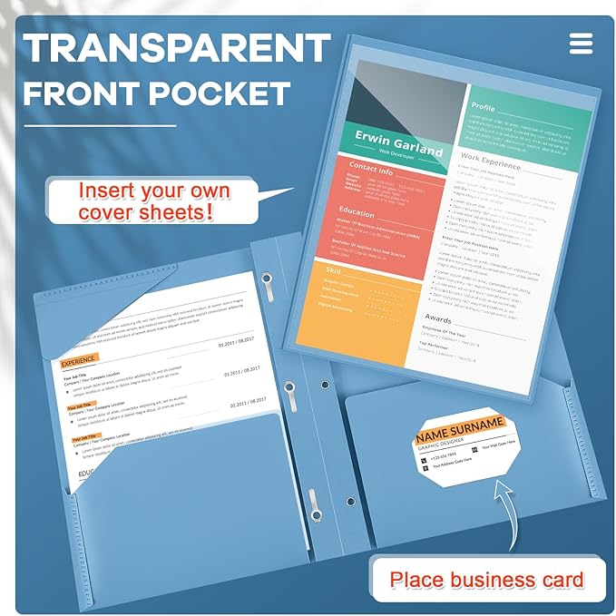 - Practical and Useful: with a clear front pocket, you can put your catalog, tables, favorite reports, presentations and more for clear display; Each plastic folder has 2 internal pockets to help organize and store your letter sized paper and documents; There are also 3 prongs to secure your 3-hole loose leaf paper in case it falls, and the card slot can hold your ID card or business card, practical for your daily work
