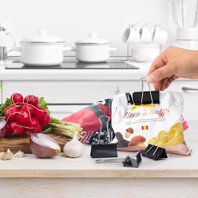 - Binder clips are ideal keeping organized of large stacks of loose paper securely fastened together and keep all foods air closed for office, home, school and crafts