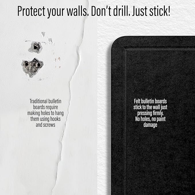 - EASY TO INSTALL, SAFE FOR WALLS โ This bulletin board uses a hook and loop system to attach securely to the felt board, paired with a strong adhesive backing that sticks to your wall. Setup is quick, clean, and damage-freeโno tools, glue, or nails required. Safe for homes, classrooms, and offices, this black cork board makes mounting effortless.