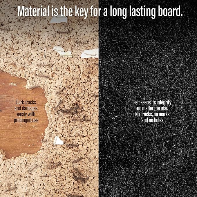 - LIGHTWEIGHT, DURABLE & PIN-FRIENDLY โ Crafted from high-quality polyester fiber, our large felt board is lightweight yet sturdy. The 0.35-inch thick surface holds push pins tightly, resists wear, and self-heals over time, making it the ultimate cork board for long-term use.