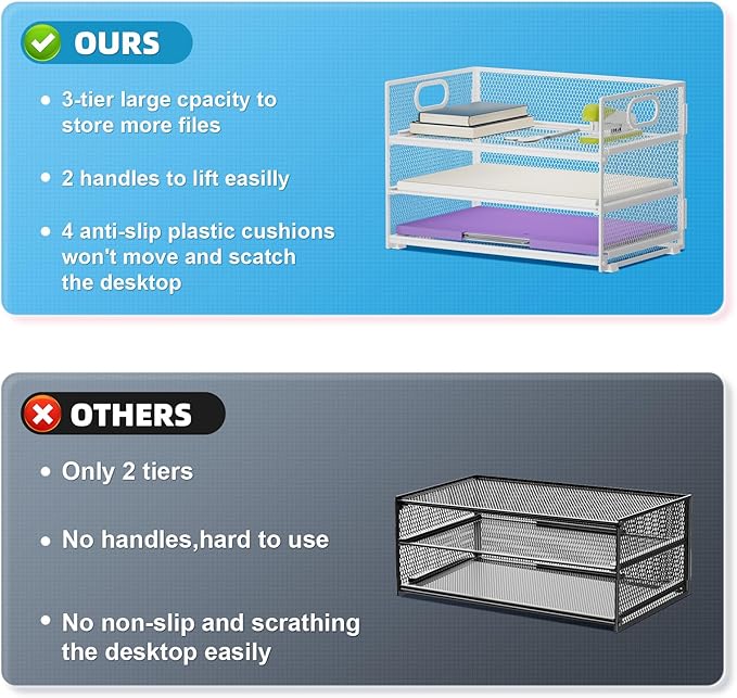 - 【MULTI-PURPOSE ORGANIZER】3-tier layered design and large capacity make the paper organizer become an ideal choice for managing all kinds of letter-size letters, paper, books, bills, etc. Let you quickly identify the contents of each compartment super easy!
