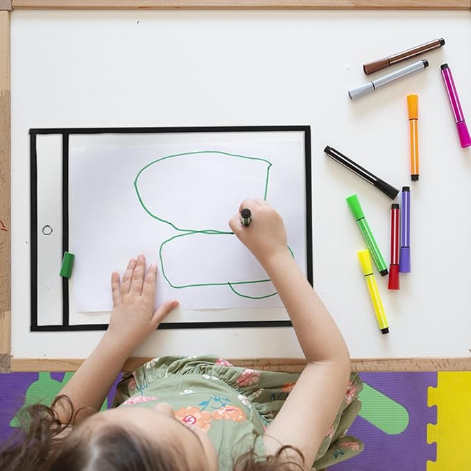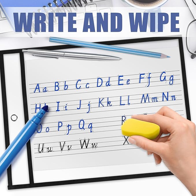 - [Large Size Organization] The dry erase pockets measure 9.5x12 inches inside, making them the perfect size for a variety of needs, including 8.5x11 inches of paper, 9x12 inches of paper, and more. And the large size makes it easy to change the paper in it.