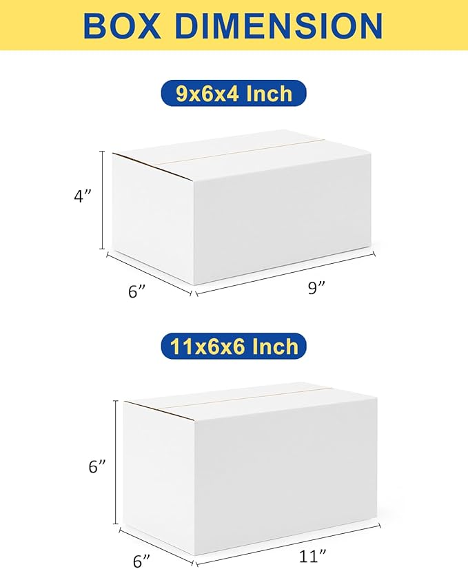 - Small Shipping Boxes 40 Pack: Each set includes 20 pcs of 9x6x4 inches and 20 pcs of 11x6x6 inches white shipping boxes. Convenient quantity of 40 pack assorted sizes shipping boxes meets most shipping needs and packaging needs