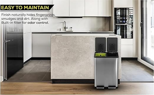 - HANDS-FREE USE: The stainless-steel foot pedal stands up to daily use and removes the need to touch the lid during waste or recycling disposal to keep hands clean.
