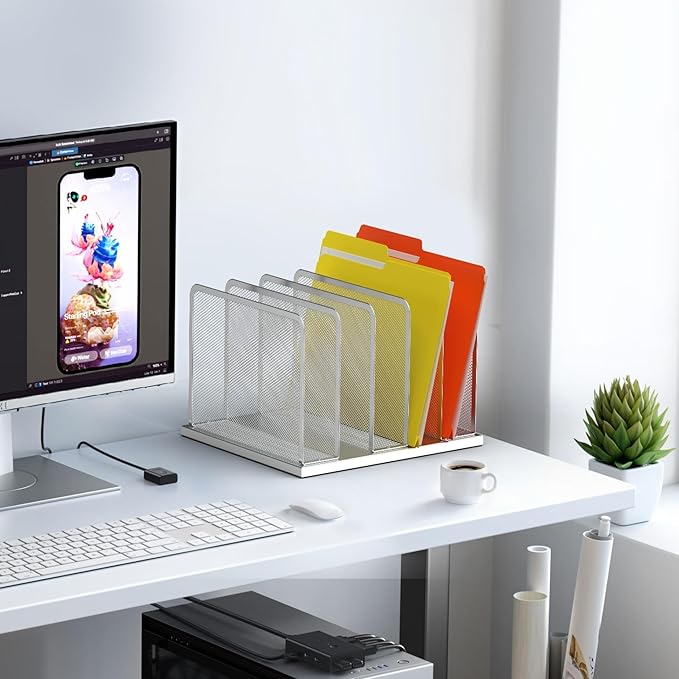 Kuntine.B Desk File Organizer Upright Mesh Desktop Organizer File Sorter Office Organization File Holder for Home, Office & Classroom (Silver, 1 Pack 5-Section)