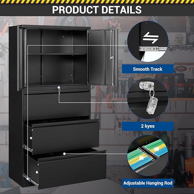 - LARGE STORAGE SPACE - There has a adjustable metal shelves inside the cabinet, which is suitable for storing toolbox, storage box, documents and sundries, etc. The size of the metal drawer is H11.8*W30*D14.8 IN; There has an adjustable metal hanging bar inside the drawer to store Letter/Legal/F4/A4 documents. If you need to store other types of articles or documents, you can remove the metal hanging bar to get more storage space.