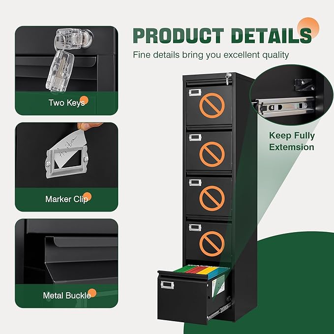 Letaya 5 Drawer File Cabinet with Lock,Metal Office Filing Cabinets for Home Office- Storage A4/F4/Letter/Legal -Assembly Required (Black)