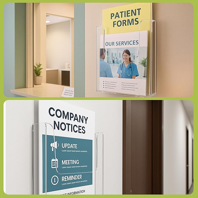 - CLEAR ACRYLIC BROCHURE HOLDER: Made from premium clear acrylic, this brochure display holder offers a sleek, modern look that enhances the visibility of your brochures and literature, while ensuring durability and stability for everyday use in busy environments. Good for wall mounting, it keeps your materials neatly displayed.